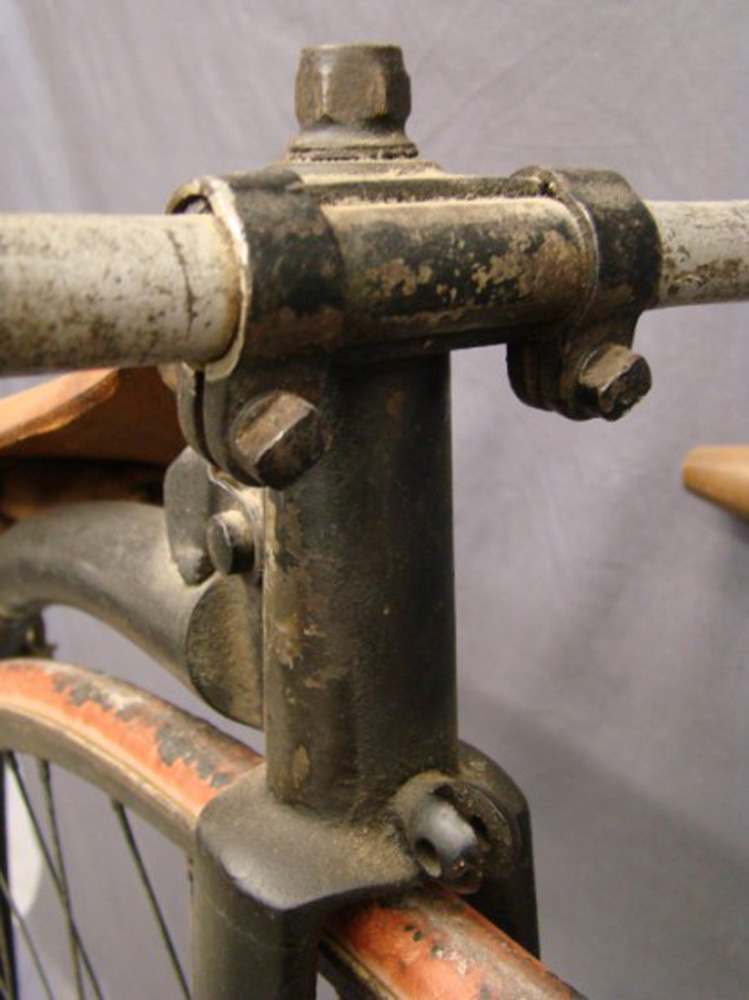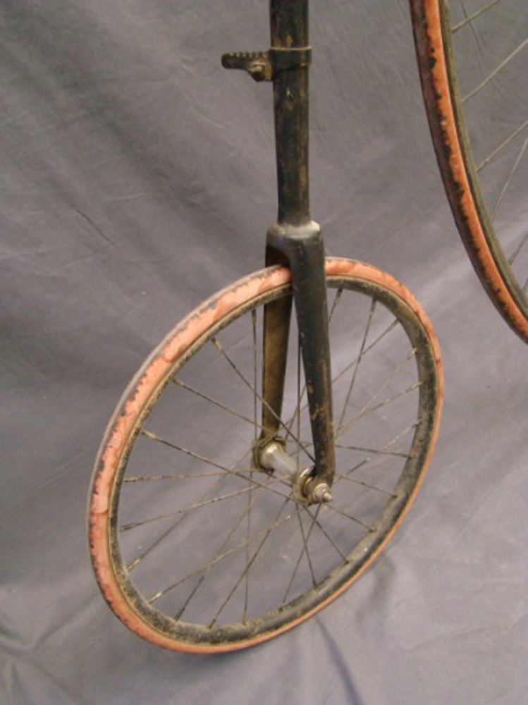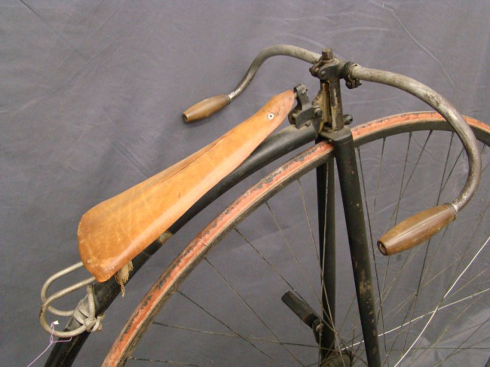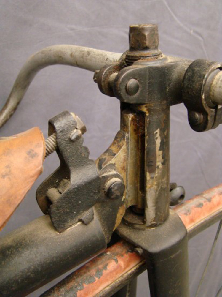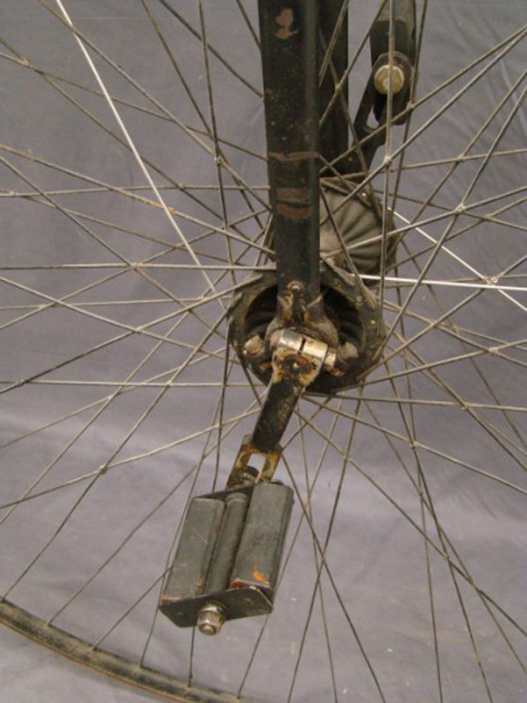 This 54 inch example with Lillybridge Hammock saddle was sold on the Copake auction in New York in 2010. The rear hub is not original. The pedals are ugly remakes an the brake hardware is missing, but it stills shows a very sophisticated bike, with beautifully shaped front hubs and a the (ball bearing) head with patented handlebar clamp. You can't confuse it with any other machine: that's what I call individual character!